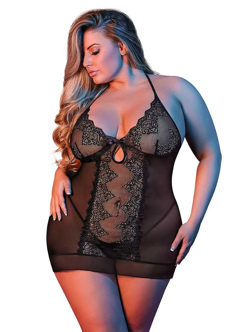 Exposed by Magic Silk collectie 2-delig chemise set van mesh en kant. De chemise heeft een key-hole en elastische bandjes die je in de nek kunt strikken. Inclusief bijpassende mesh string.