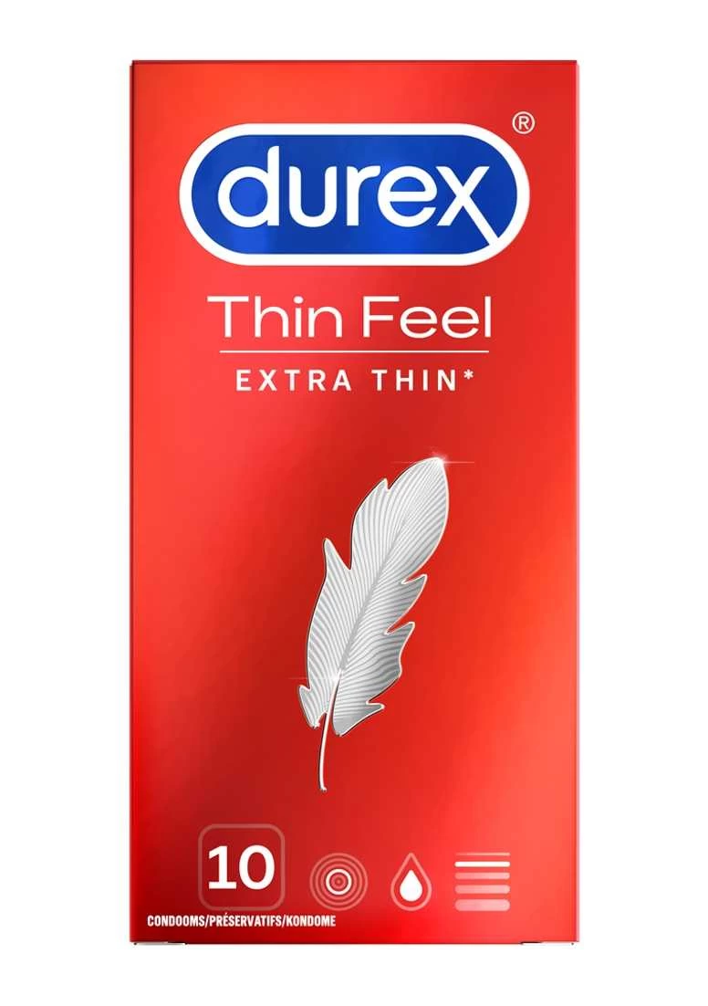 The Durex Thin Feel Extra Thin condoms are extra thin for an even more intense experience than with our Thin Feel condoms.No form of contraception offers you 100% reliable protection against pregnancy HIV (AIDS) or other sexually transmitted diseases. Read the instructions on the inside of the package carefully especially when using the condom for anal or oral sex.