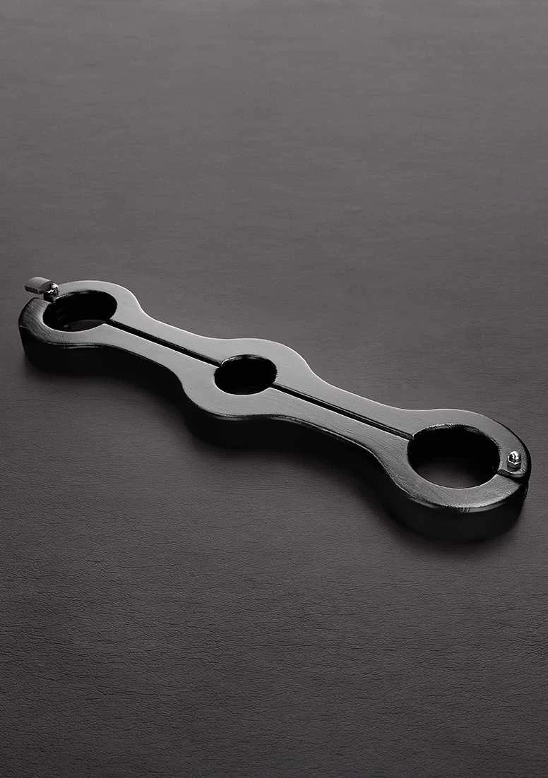 Cute femdom humiliation pillory for brutal linking of hands to male genitalia (penis plus scrotum). Unique Lederhalts design splined connection and fixing with single pin.