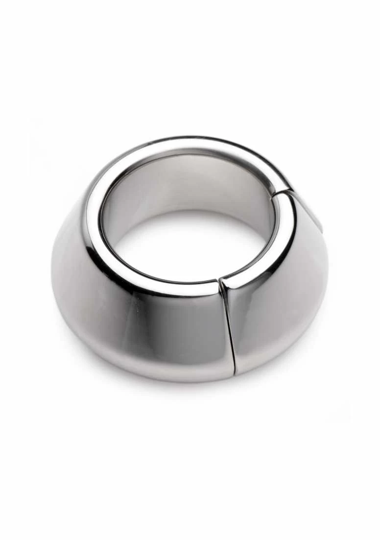 Made of heavy-duty stainless steel this parachute-style ball stretcher closes with a powerful magnet around your scrotum. Experience 8.6 ounces pulling down on your sensitive balls while you masturbate have sex or get teased and tormented by your partner. Gravity will take its toll creating the tugging sensation you crave and amplifying any sexual experience. The chrome-plated stainless steel is nickel-free non-porous and easily sanitized with mild soap or toy cleaner after use.