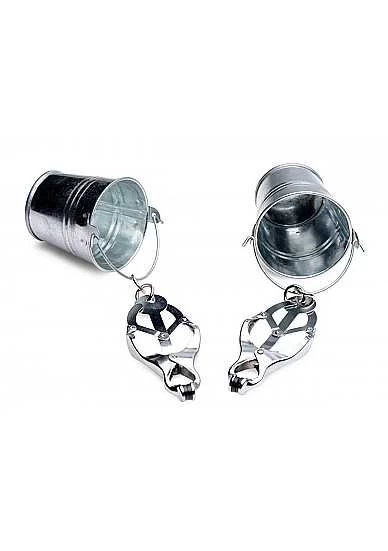 Put your submissive or slave through a unique torment with a set of nipple clamps that allow you to add weight in an unusual way! In the style of butterfly clamps or clover clamps these attractive pincers get tighter as they are pulled. Rubber tips ensure that all pain is in the form of pleasure and that they maintain their grip. To add weight simply fill the small hanging buckets with water lube sand stones or whatever your devious mind can come up with. You will love watching your plaything carry the buckets around by their tits!