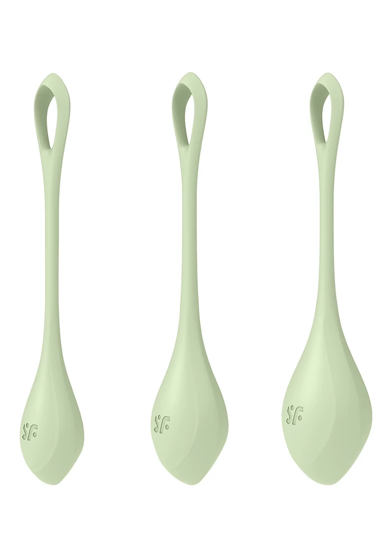 Yoni Power 2 – Balls Training Set – Light Green – Our Yoni Power 1 and Yoni Power 2 are designed to help strengthen the pelvic floor muscles. Our ?Yoni? balls made of body-friendly silicone with a retainer ring are hygienic and an effective way to train the muscles deep within the pelvic bowl. The unique egg shape helps target your pelvic floor muscles. The larger ball is recommended for beginners and the smaller ball is for more advanced users. Training daily with ?Yoni? balls has been proven to help create stronger and more intense orgasms. With an increase in control of vaginal muscles it can heighten your partner?s pleasure. Yoni Power 1 has a rounded shape and is available in White and Red. Yoni Power 2 has a similar egg shape with a slightly pointed tip and is available in Black Light Green and Light Blue. Order today!