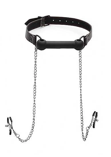 Ideal for training your pony submissive or slave this combination of a bit gag and nipple clamps ensures that your plaything stays quiet even as you deliver painful pleasure to their delicate nips! Stuff the premium silicone bit into their mouth and secure it with the soft adjustable red-stitched straps. The intensity of this devious device is taken up a notch with the addition of two connector chains on the metal rings that hold the gag. Each ends in an alligator nipple clamp which allows you to adjust the pressure with thumbscrews. Vinyl coated tips make for a comfortable and secure grip. Enjoy every muffled moan and stifled gasp as you tease and torment your pet!?