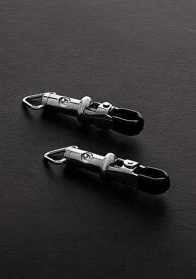 Deze zware tepelklemmen met kubieke zirkonium rond de handgrepen hebben een bungelende ring aan het uiteinde die je talloze bondage-opties biedt. De ringen zijn perfect voor het bevestigen van touwen of kettingen om elke opstelling voor tepelmarteling te cre?ren die je je kunt voorstellen. De klemmen zijn in hoge mate verstelbaar via hun schroefdraadtongen.