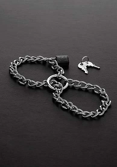 Zulke simpele kettinghandboeien. Door het smalle uiteinde van de ketting door beide grote ringen te draaien kunt u twee lussen maken die de polsen (of enkels) nauw omringen. Daarna wordt de ketting beveiligd met behulp van een hangslot.
