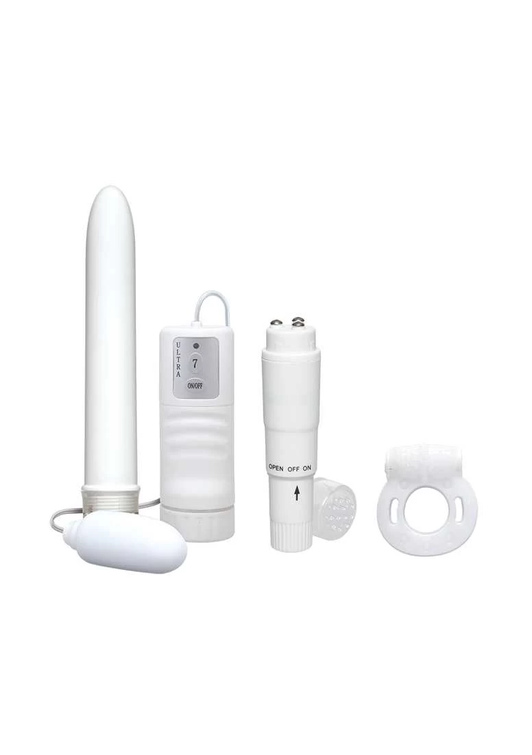 Stay up all night playing with these vibrators! This White Nights Pleasure Kit includes the best-selling 7-inch Velvet-Touch Vibe, the Original Pocket Rocket, the White Nights Bullet Vibe, and a Vibrating C-Ring, to satisfy all of your naughty cravings.